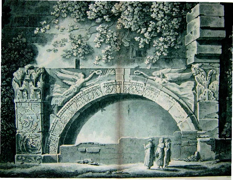 Cette vue présente l’intérêt de montrer l’arc dans sa situation avant 1827, lorsqu’il était inclus dans les bâtiments de l’évêché. Après cette date les dépendances épiscopales furent rasées, mais le monument antique préservé. Elle a été dessinée par M. Bence, architecte de l’Etat, vers 1815 (qui a également relevé plusieurs monuments antiques du Vaucluse, dont l’arc de Carpentras) et fut publiée en 1816 par Laborde. On relève l’état très dégradédu monument, dont la façade principale, ornée des victoires latérales (que l’artiste a outré par leur taille), paraît remaniée et totalement intégrée aux constructions médiévales, qui paraissent également remployer des blocs antiques. On note que l’arc est semi enterré, quasiment jusqu’aux impostes. Enfin,par un jeu de proportion connu depuis Piranèse ou Hubert Robert, la taille des personnages est extrêmement réduite, afin de rendre la ruine plus grandiose.Il existe d’autres versions de cette scène : dans l’une gravée par Baugean et imprimée à Paris, les trois élégantes sont remplacées par un homme portant canne, chapeau et cartable (sans doute un savant), et où l’échelle est tout aussi disproportionnée.