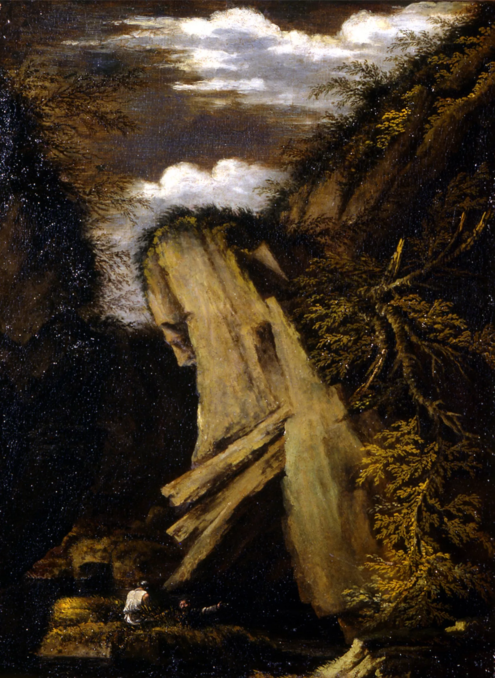 L'effet de profondeur est également traduit par l'étagement en gradins de blocs de rochers aux formes géométriques ; sur la droite, certains forment une arche au travers de laquelle est vu le paysage, procédé qu'emploie à plusieurs reprises Mantegna.