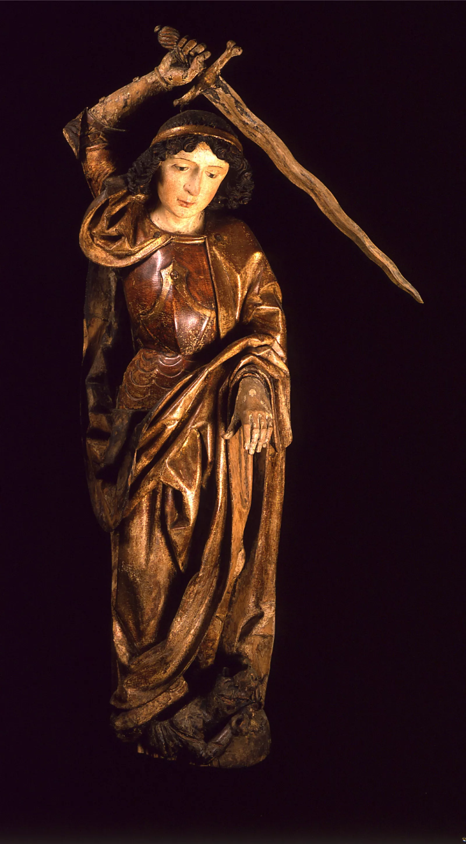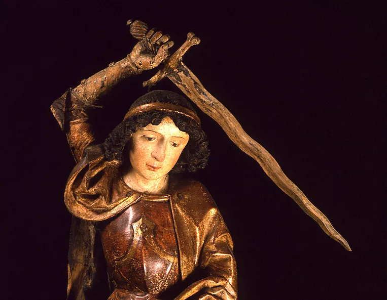 Saint Michel, le chef des milices célestes, brandit son épée flamboyante pour combattre le dragon qui menace la Femme et son Enfant dans le récit de l'Apocalypse (12,7). Le petit monstre à ses pied, déjà entaillé par les coups d'épée, paraît assez peu terrifiant. Bien que l'archange ne soit pas ailé, il ne peut être confondu avec saint Georges puisque le geste de sa main gauche suggère qu'il tenait peut être la balance pour peser les âmes au Jugement dernier, son autre fonction très populaire au Moyen Age. Du reste, son bras droit levé est un motif typique des représentation du saint, illustré en particulier par les gravures du maître E.S. (L. 153, L. 154). La sculpture, évidée au revers, était placée à l'origine dans la caisse d'un retable.Le lourd visage joufflu de l'archange, aux volumes simples et lisses, et le dessin des grands yeux obliques, aux paupières bombées cernées par un sillon bien marqué, évoquent les types physiques juvéniles ou féminins courants dans la sculpture tyrolienne de la fin du XVe siècle, et notamment issus des figures sculptées par Hans Klocher (cité à Brixen de 1478 à 1498) et ses imitateurs. Néanmoins, le traitement du drapé se fait moins durement incisif que chez le maître de Brixen. LEs plis tubulaires aux arêtes arrondies se brisent plus mollement, l'étoffe se plaque contre la jambe droite et le bord du manteau replié sous le bras droit trace une longue courbe. Cette conception semble davantage dériver des modèles proposés par les oeuvres de Michael Pacher (cité à Bruneck à partir de 1467 ; Salzbourg, 1498), comme le retable de Gries (1471-1475) près de Bozen. Les détails de l'armure sont rendus avec la précision habituelle à ce type de saint chevalier et ses formes aiguës confirment la datation de l'oeuvre dans les dernières années du XVe siècle ou les toutes premières du suivant.
