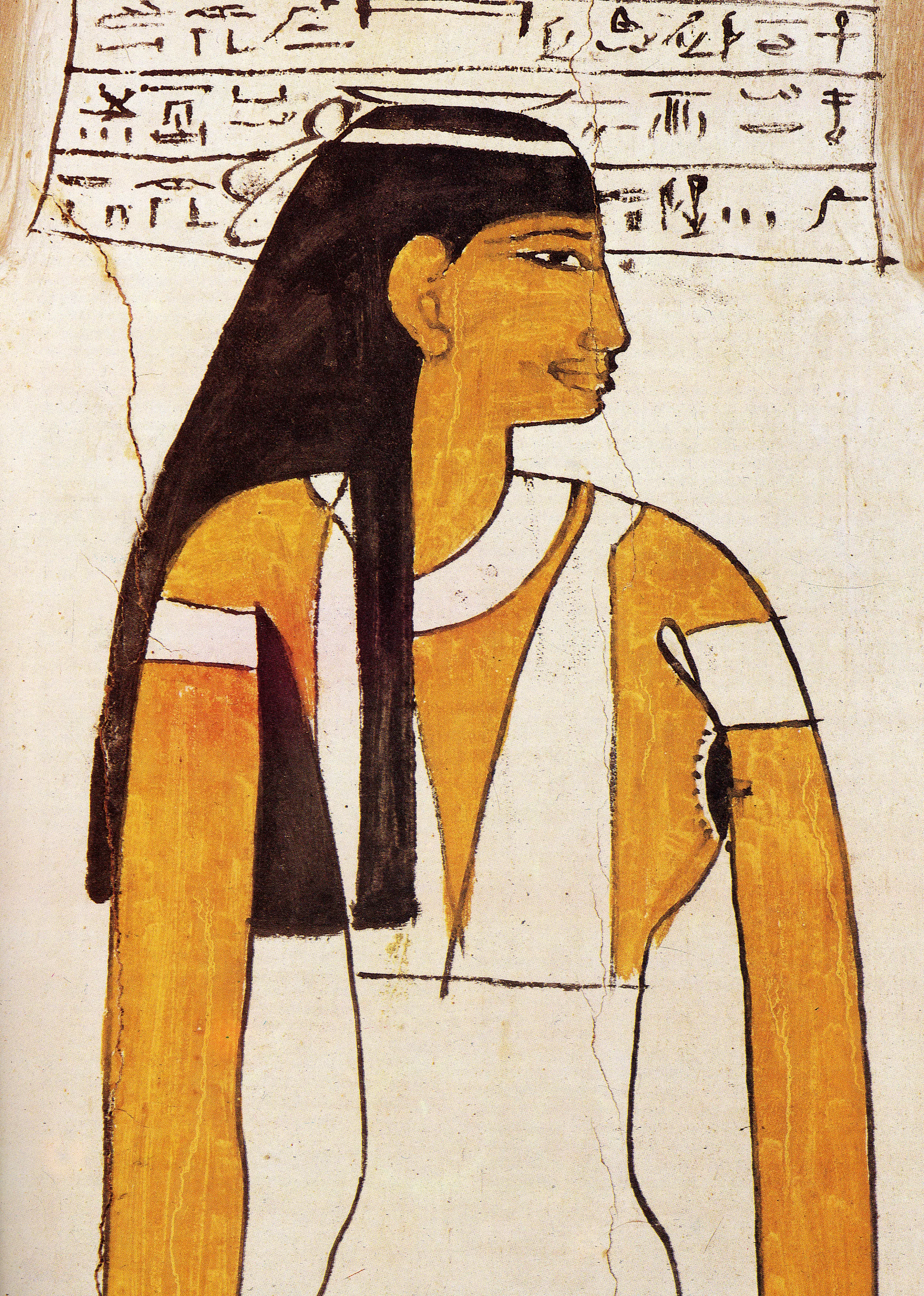 La défunte, au cou paré d'un grand collier végétal qui rappelle celui que l'on avait coutume de déposer sur la poitrine des morts porte une perruque tripartite bleu et jaune pour la rendre pareille aux dieux dont les cheveux sont de lapis-lazuli. La ligne des cheveux se perçoit sous la coiffure; les détails du visage - yeux, sourcils, oreilles, bouche - ont été marqués à l'aide de peinture sombre.