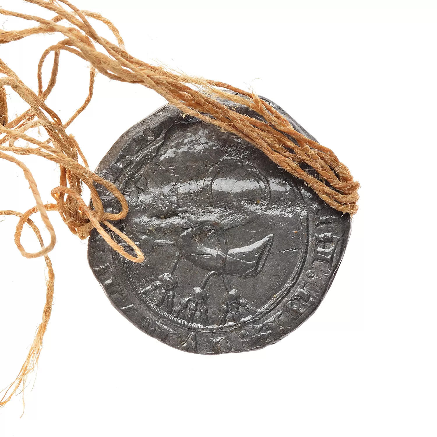 Sceau en plomb détaché par moi d'un parchemin tronqué , portant à son revers "achat par Jeanne Ravel etc…"1599