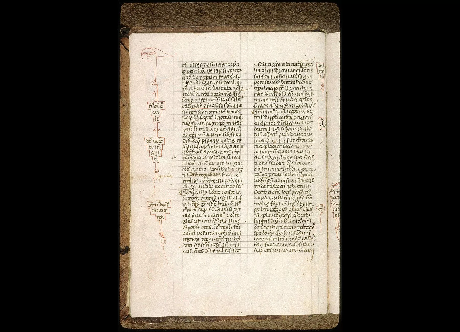 Commentaires de Labande. XIVe siècle. Parchemin. 440 feuillets à 2 col. 234 à 168 millim.Rel. bois, recouvert de basane, avec restes de fermoirs en cuivre. (Célestins de Gentilli.)