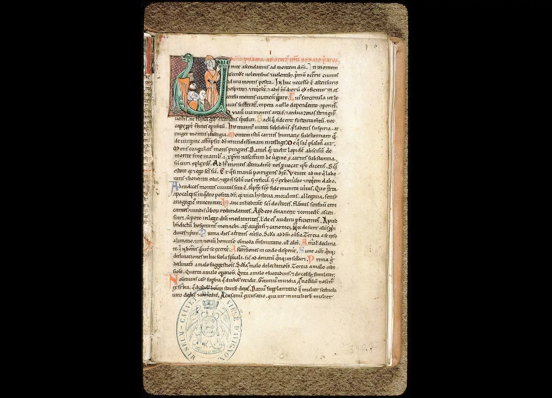 Commentaires de Labande. XII-XVe siècle. Vélin et parchemin. 96 feuillets, les feuillets 65-72 à 2 col. 197 sur 135 millim. Initiales de couleur, l'initiale dupremier sermon de chaque fête jusqu'au fol. 46 est miniaturée presquetoujours avec personnages, et le sujet représente une scène de la fête.Rel. bois, recouvert de peau chamoisée, avec dos en basane. (Célestins d'Avignon, 4 A 16.)
