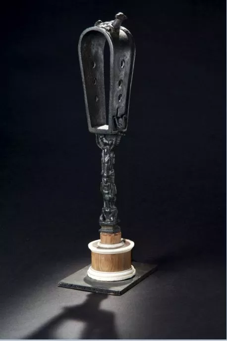 Sur le sommet du cintre, une chienne est allongée en train d'allaiter deux petits. A la base de l’arceau, une couronne hathorique surmontée de la double rémige a été stylisée sur chaque côté. Ils encadrent le haut du manche, qui est entièrement sculpté en haut relief. Sur une face, de haut en bas, ont été représentés un animal vu de profil et deux formes masculines l'une au-dessus de l'autre.