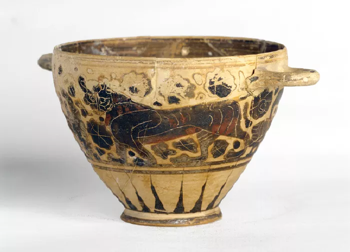 Ce vase à boire, à parois très fines et vasque assez haute, comporte un décor caractéristique : une frise -lion suivi d’une panthère- ponctuée de rosaces et de points. Les figures animalières très allongées, le remplissage très serré de la surface se retrouvent de manière plus ou moins élaborée sur bien des exemplaires de la série, fabriqués en grande quantité et très largement exportés dans tout le bassin méditerranéen. L’anse de droite, manquante, a été reconstituée.