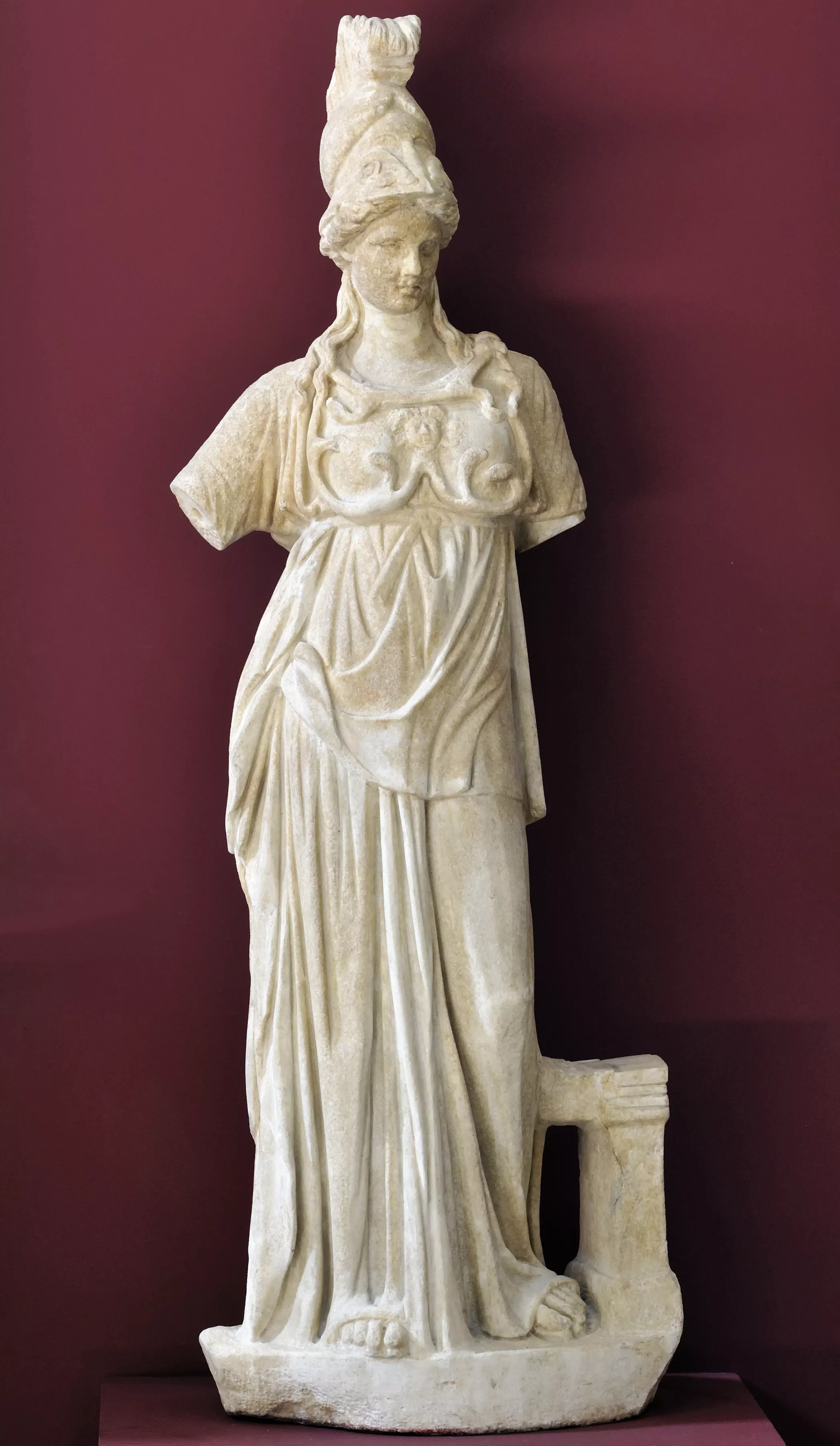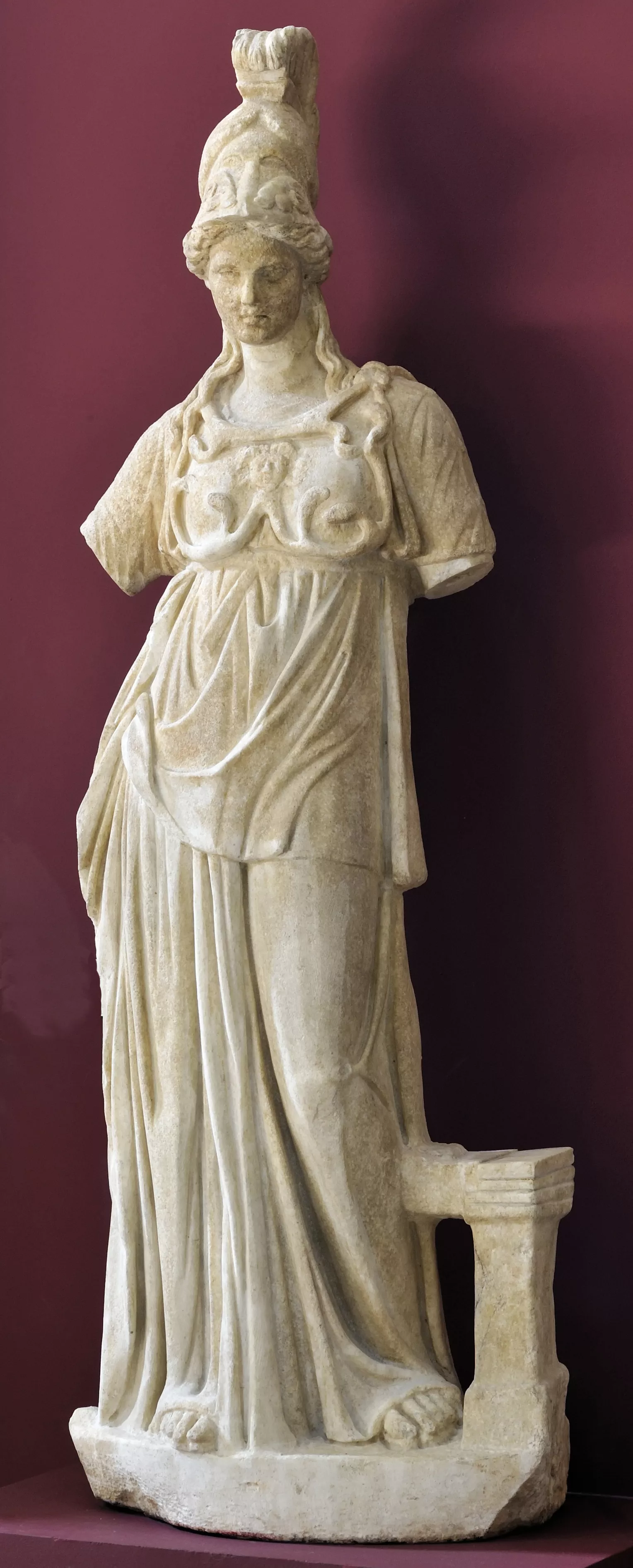 Contre la jambe droite de la déesse figure un petit pilier quadrangulaire. La statue a été considérablement retravaillée à l’époque moderne : des pans entiers de la draperie, une partie du casque. En revanche, le dos est intact.