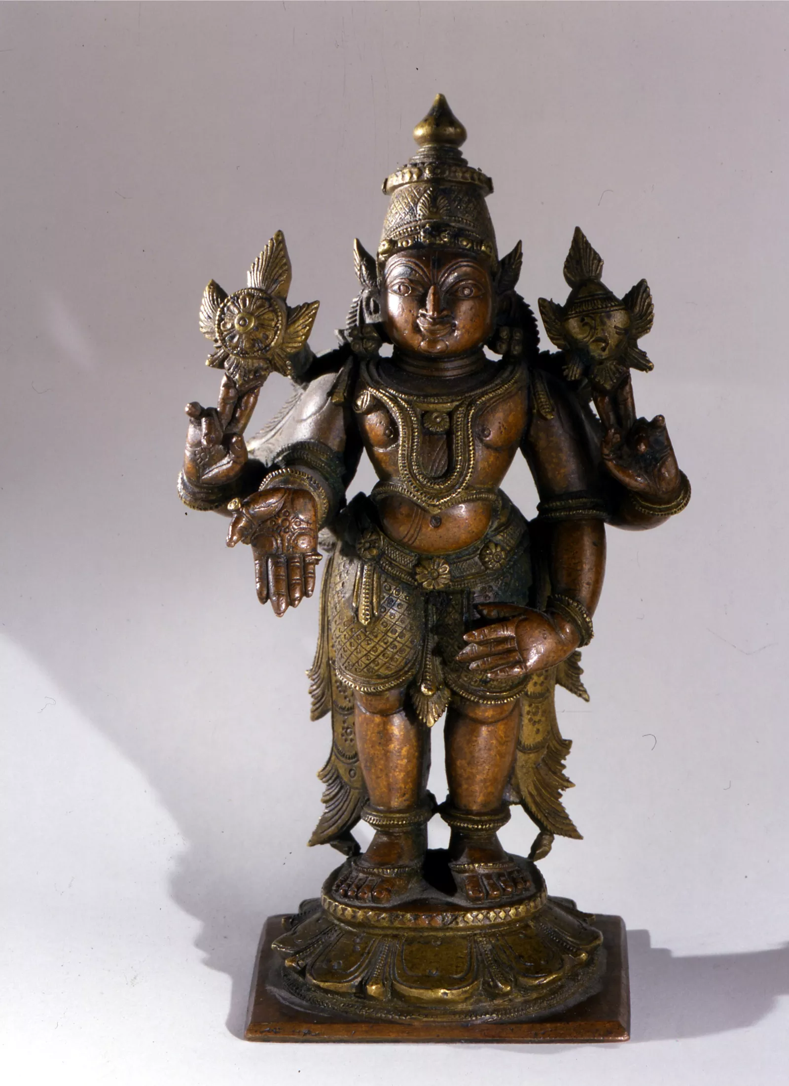 En attitude frontale et hiératique, debout sur un socle fait de pétales de lotus stylisés et coiffé de la tiare.Les deux mains supérieures du dieu tiennent la conque ( à droite) et le disque (à gauche) ; la main inférieure gauche fait le geste du don.