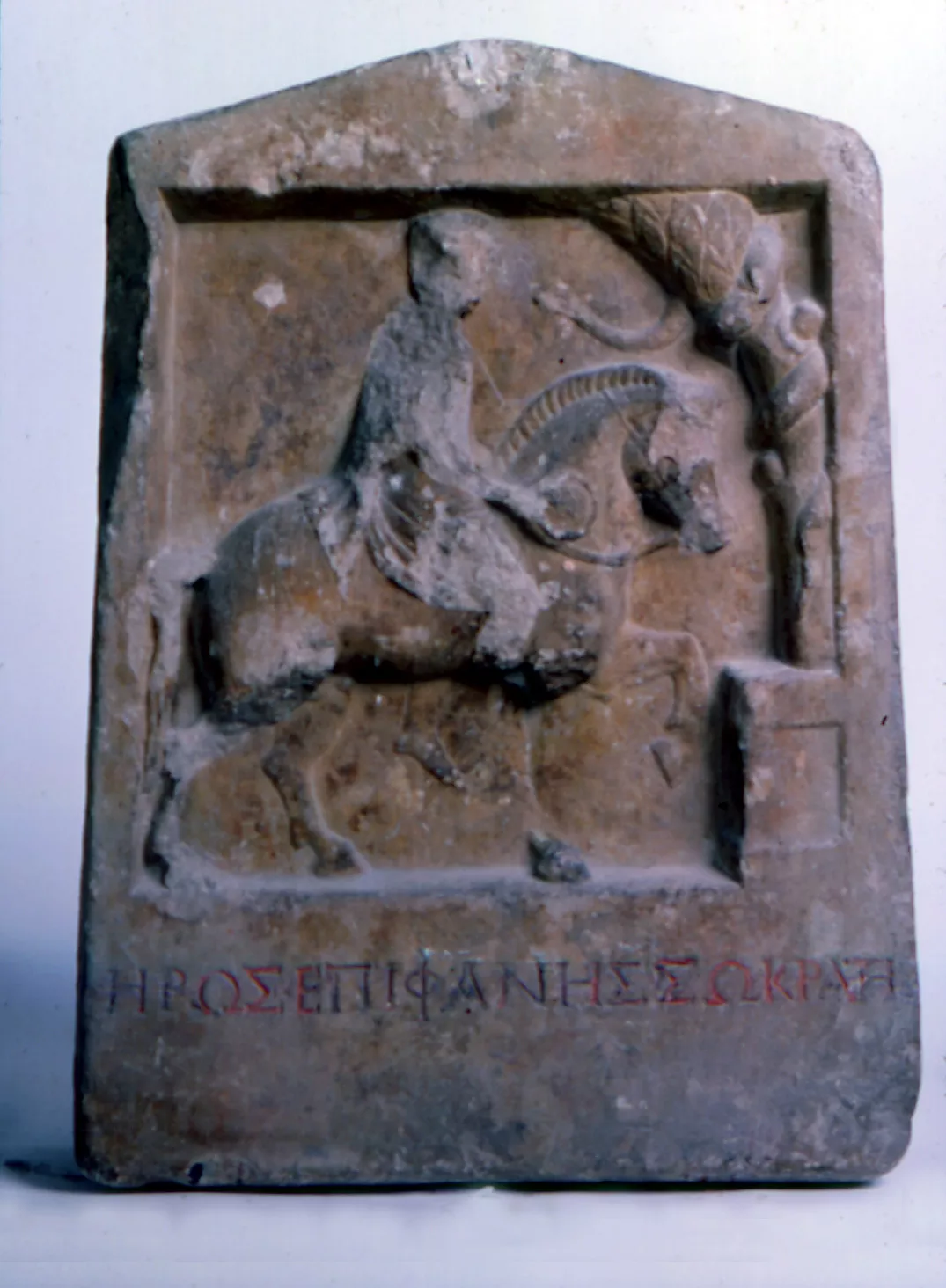 Plaque de forme pyramidante surmontée d’un fronton étroit. Un cavalier, vêtu d’une tunique courte et d’une chlamyde (sorte de casaque courte), une phiale (coupe à libations sans pied) à la main droite, se dirige vers un autel situé à droite du relief, surmonté d’un arbre autour du tronc duquel s’enroule un serpent. Ce dernier darde sa tête vers celle de l’homme, le défunt, « Socratès héros épiphane » La stèle s’inscrit dans une série très connue à l’époque hellénistique et impériale dans les colonies grecques du Pont-Euxin (Odessos, Istria, Callatos).