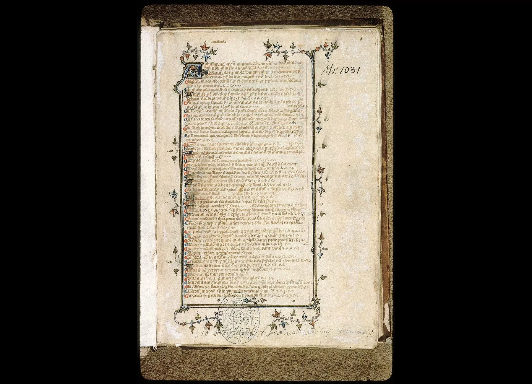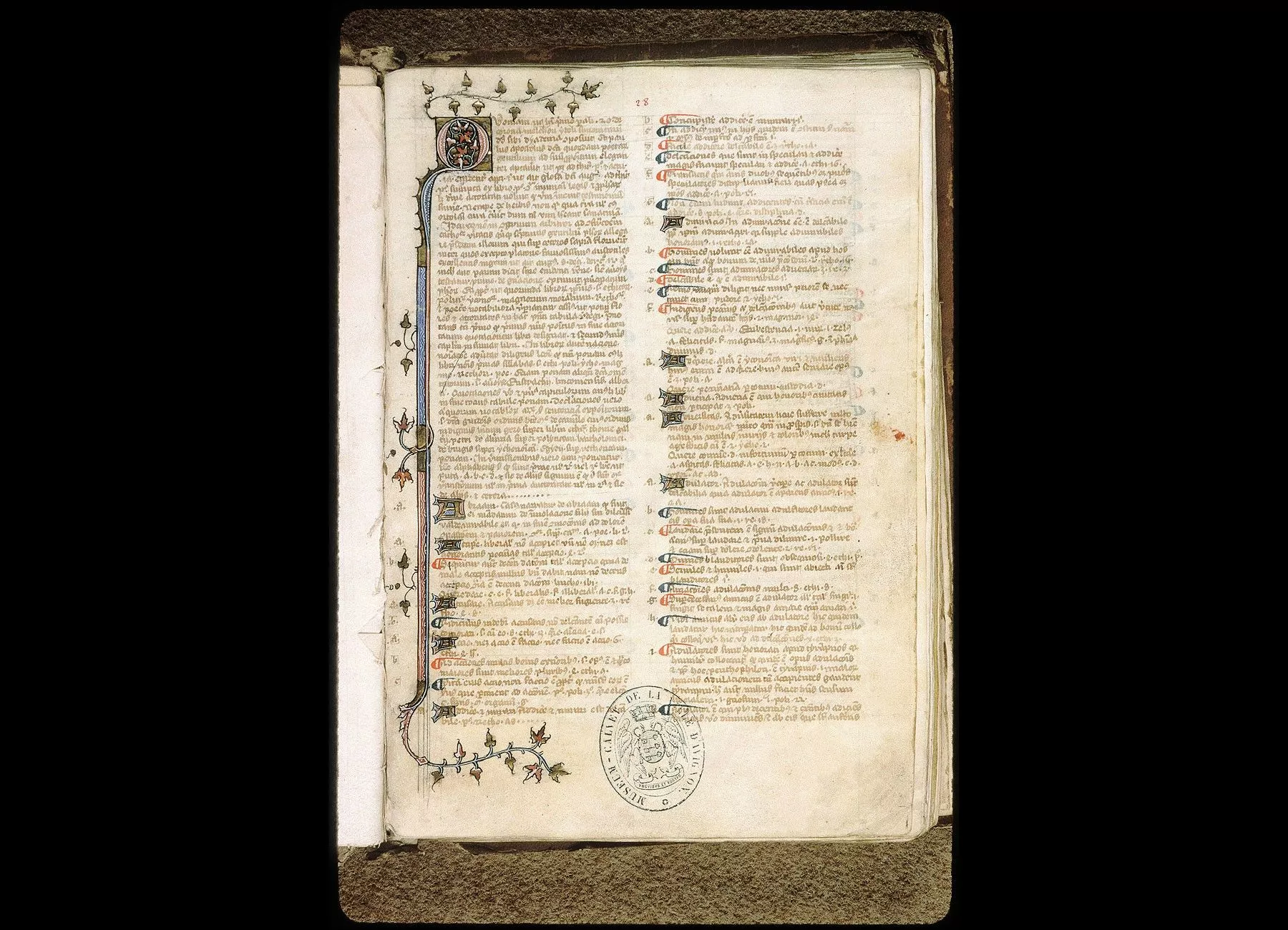 Commentaires de Labande. XIVe siècle. Parchemin. 115 feuillets à 2, 4 et 6 col. 293 sur 198 millim. Initiales miniaturées aux fol. 1 et 28. Rel. basane. (Frères Prêcheurs d'Avignon.)