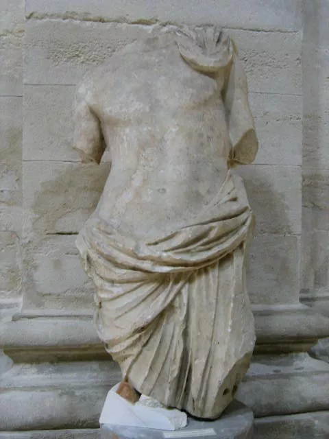 Fragment d'une statue masculine. La tête est recouverte d'un voile.