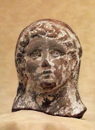 Toute la partie antérieure est au contraire moulée et complétée par des éléments rapportés : périphérie des oreilles, mèches glissées devant et sous les oreilles, d'autres collées sur l'armature de la coiffure elle-même disposée en "côtes de melon" à droite ; outre la dissymétrie de la coiffure, la variété des mèches désordonnées relève d'un naturalisme un peu affecté. Au-dessus de l'encolure du manteau, visible sur notre droite, encolure de la tunique qu'il recouvre. Le visage un peu inclinévers la droite est plein, lourd même, les maxillaires, enveloppés, surtout à gauche, le menton globulaire, porté haut et vers l'avant. Les muscles latéraux du cou sont particulièrement saillants. L'expression pensive voire boudeuse tient aux formes et procédés d'expression : au-dessus du menton, un net retrait met en valeur la bouche épaisse, haute mais courte ; protubérant, droit et plat, à racine très large, avec une pointe et des ailes à peine modelées, le nez sépare fortement deux petits yeux enfoncés auxquels les paupières inférieures remontantes confèrent une certaine tristesse.