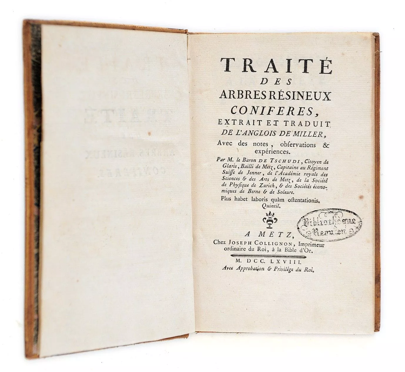 Titre complet : Traité des arbres résineux conifères, extrait et traduit de l'anglois de Miller,... Par M. le Baron de Tschudi,...