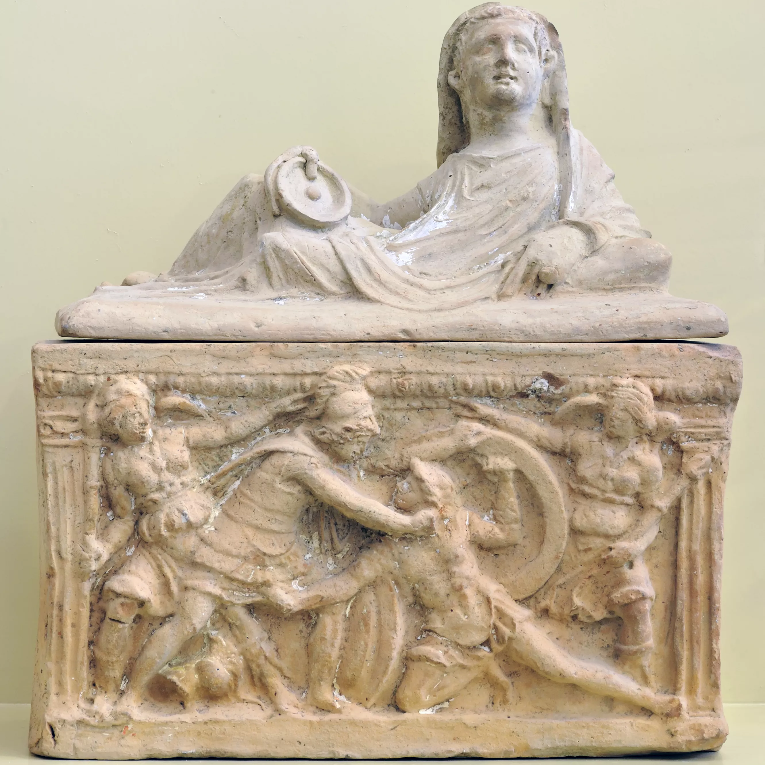 Urne funéraire de terre cuite avec le combat fratricide d'Etéocle et de Polynice en présence de deux démons féminins, Vanths
