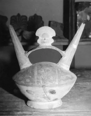 Ce vase en céramique est constitué de deux tétines reliées par une anse surmontée d'une tête à décor peint.