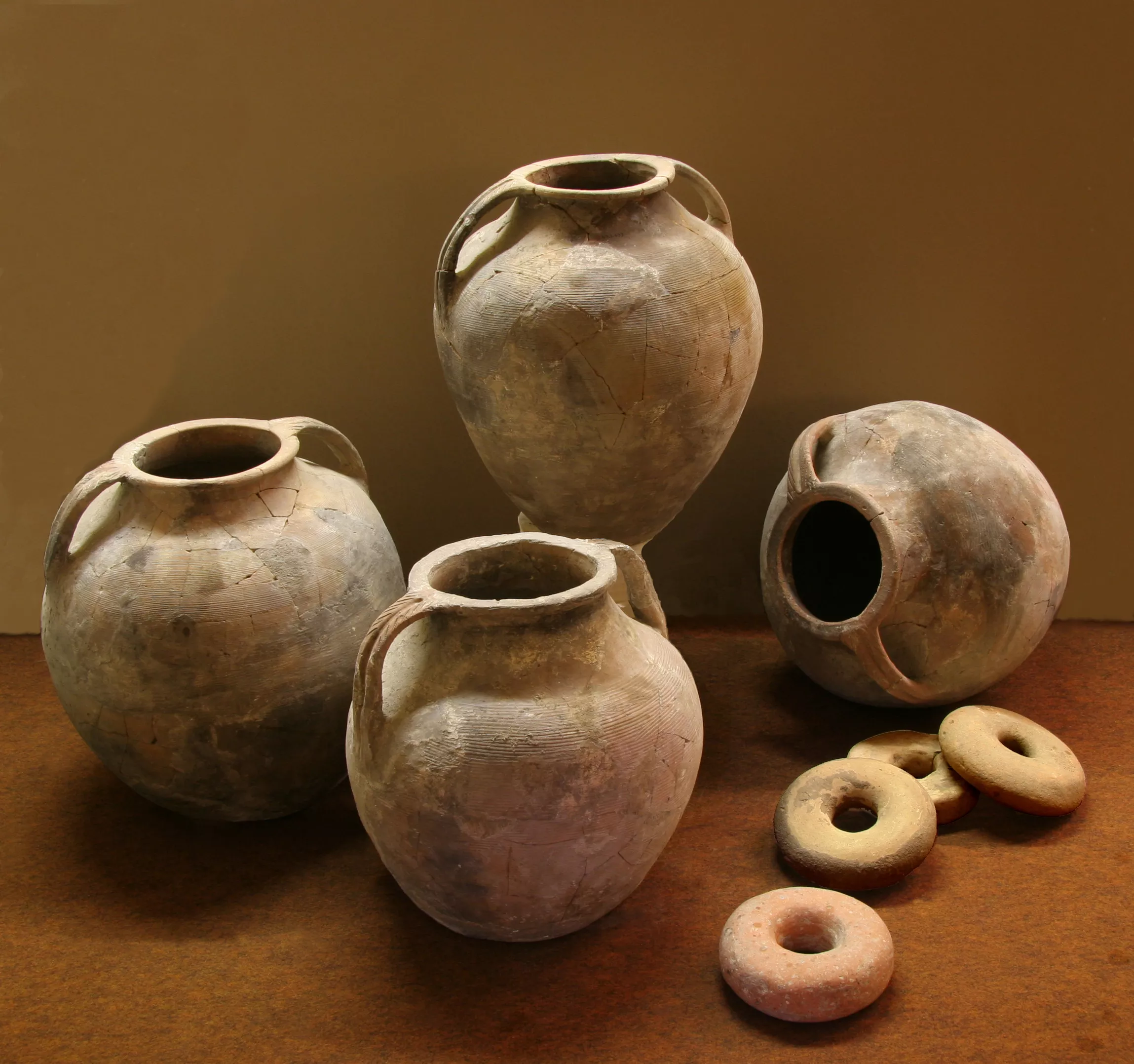 Formes fermées de grande contenance destinées au stockage et au transport des denrées : ces récipients caractérisés par une panse ovoïde peignée horizontalement et par deux anses pseudo-bifides décorées d’impressions obliques faites au peigne sont produits en séries par un vaste ensemble d’ateliers actifs au Ier s. avant notre ère dans la région des Alpilles ; vases de type Arcelin 1-5-5.
