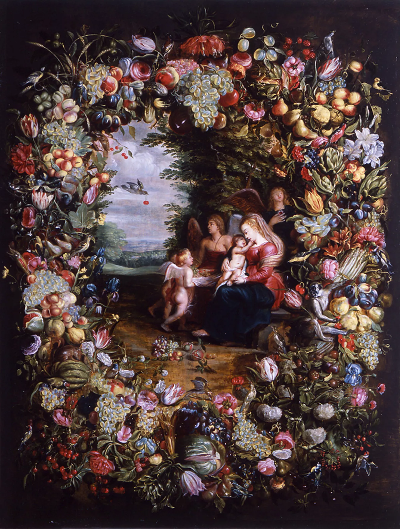 Vierge à l'Enfant dans une guirlande de fleurs et de fruits